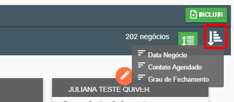 Para alterar a ordenação dos negócios, utilize o botão de ação ao lado do botão de alternância de visualização. É possível ordenar os negócios por: “Data do negócio” (considerando as particularidades desse filtro, descritas no tópico “Filtros para a consulta dos negócios”), “Contato agendado” e “Grau de fechamento” (este último exclusivo para as renovações automáticas do MULT). Dica: ao utilizar a opção “Grau de fechamento”, selecione em conjunto o botão RENOVAÇÕES, pois isso diminui a quantidade de registros.