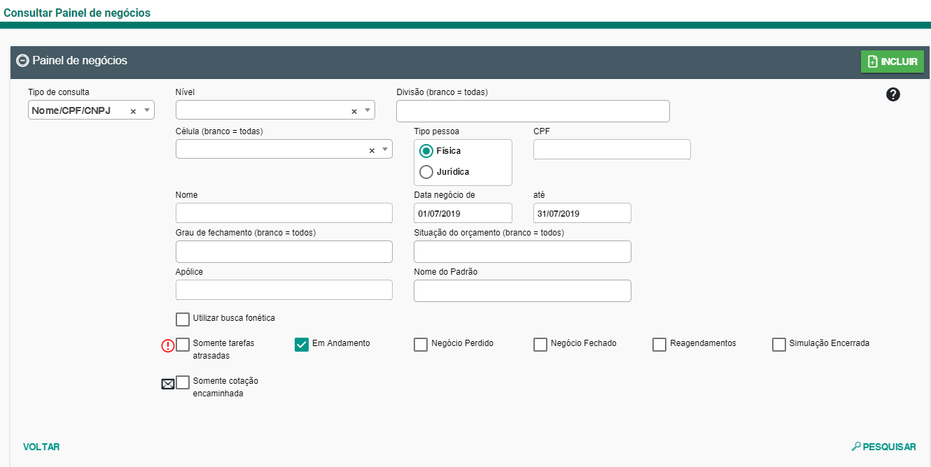 Este painel é o centralizador das negociações, pois permite incluir e consultar os cálculos de seguros, novos ou renovações, cujo usuário conectado possui acesso. Nesse contexto, consideram-se “negócios”: