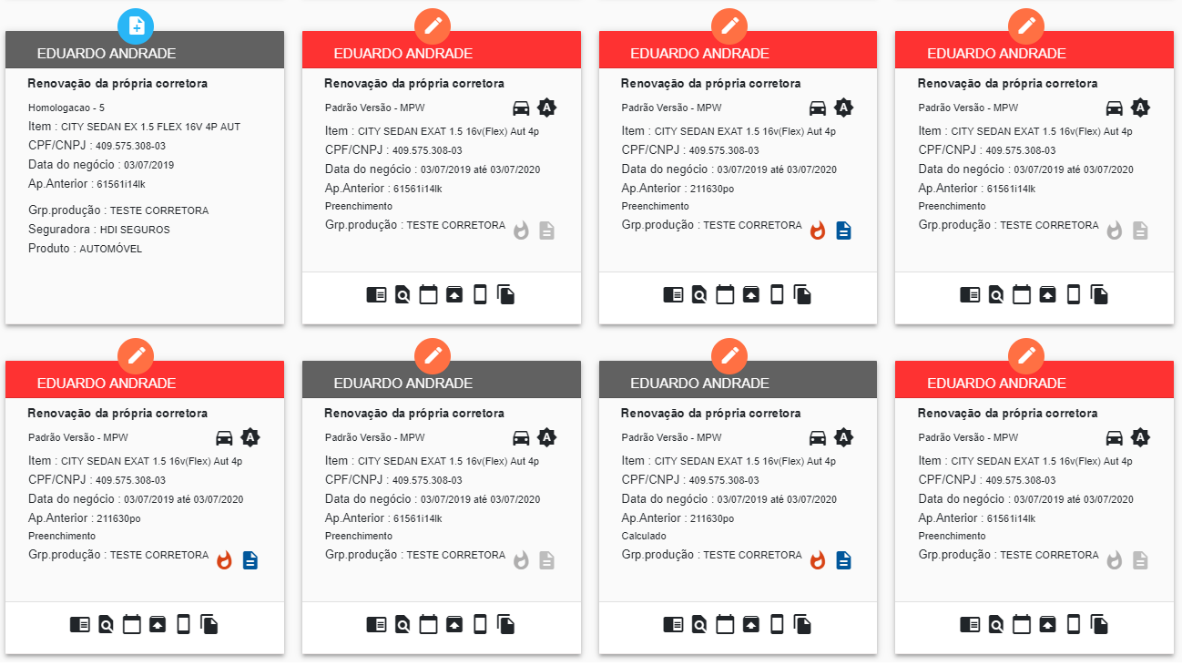 Neste modelo de exibição, os negócios são mostrados lado a lado, com sinalizadores que indicam a existência de sinistros e endossos. Os cards vermelhos sinalizam os negócios com atuação em atraso, em relação ao início da vigência, conforme prazo definido em Vendas > Tabelas > Parametrização de renovações.