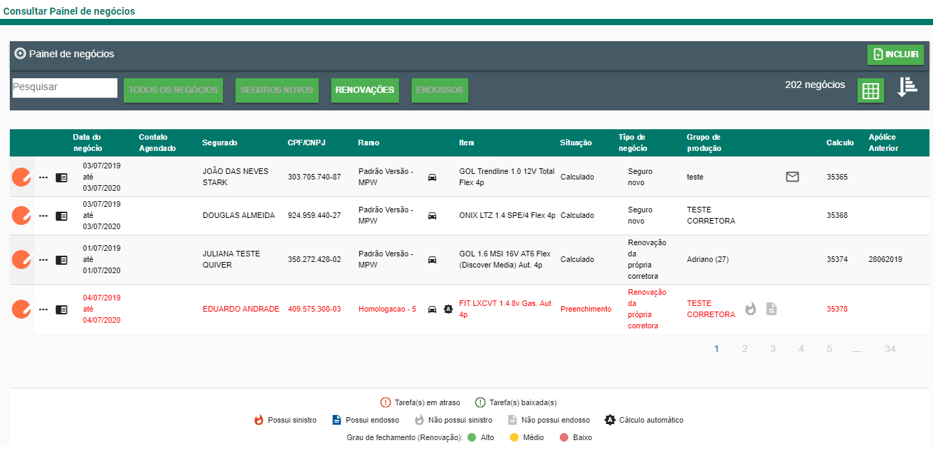 Neste modelo de exibição, os negócios são mostrados um abaixo do outro, com sinalizadores que indicam a existência de sinistros e endossos. Os negócios em vermelho indicam atraso na atuação, em relação ao início da vigência, conforme prazo definido em Vendas > Tabelas > Parametrização de renovações.